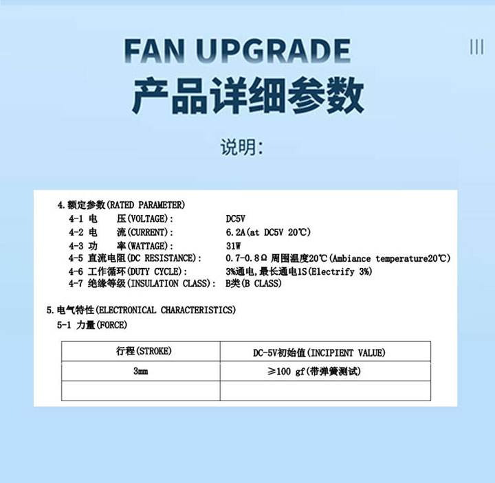 電壓: DC5V 行程: 3mm  電阻: 0.7~0.8歐 功率: 31W
